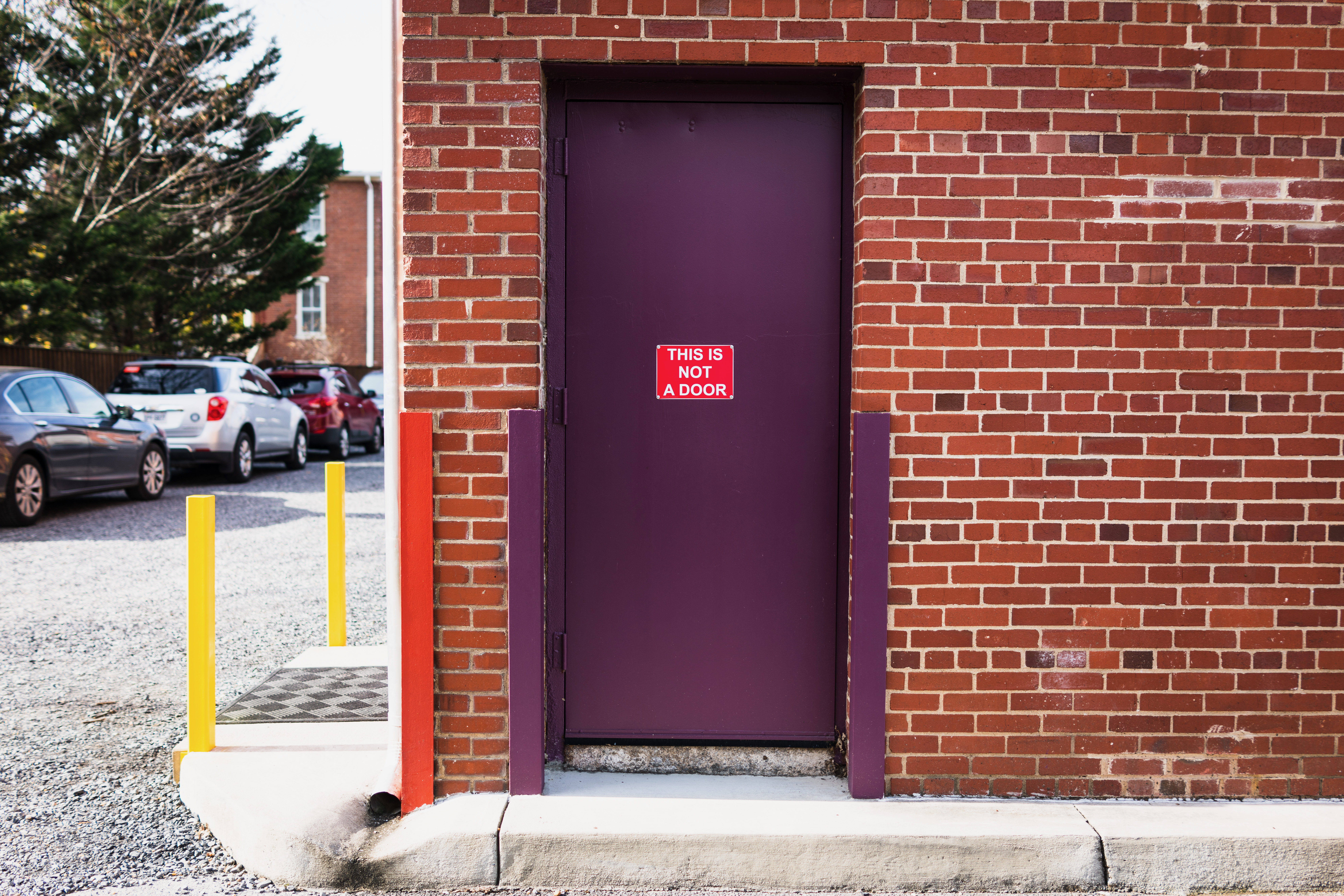 A striking juxtaposition of color and texture, this photograph features a bold purple door set against a brick wall, marked with an eye-catching sign reading, 'THIS IS NOT A DOOR.' The scene's mood is one of curiosity and humor, challenging expectations and inviting viewers to ponder the purpose of this unconventional structure.