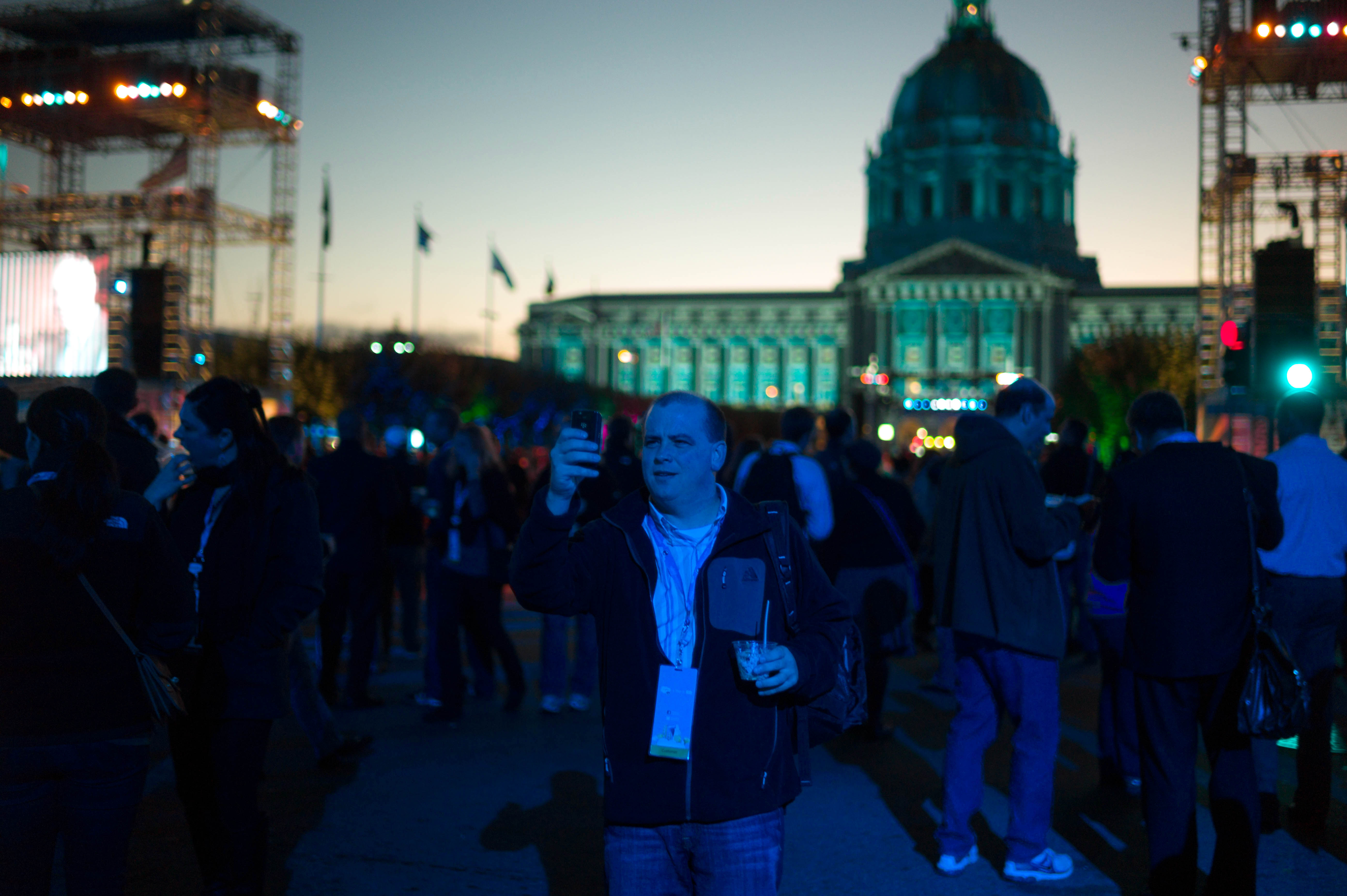In the foreground, a man captures the moment with his smartphone, seemingly engrossed in the lively atmosphere around him. The backdrop features a stunningly illuminated building as the evening sky transitions from dusk to night, adding a vibrant, celebratory mood to the scene. The crowd, shrouded in shadows yet punctuated by colorful lights, creates a sense of connection amidst the excitement of the event.