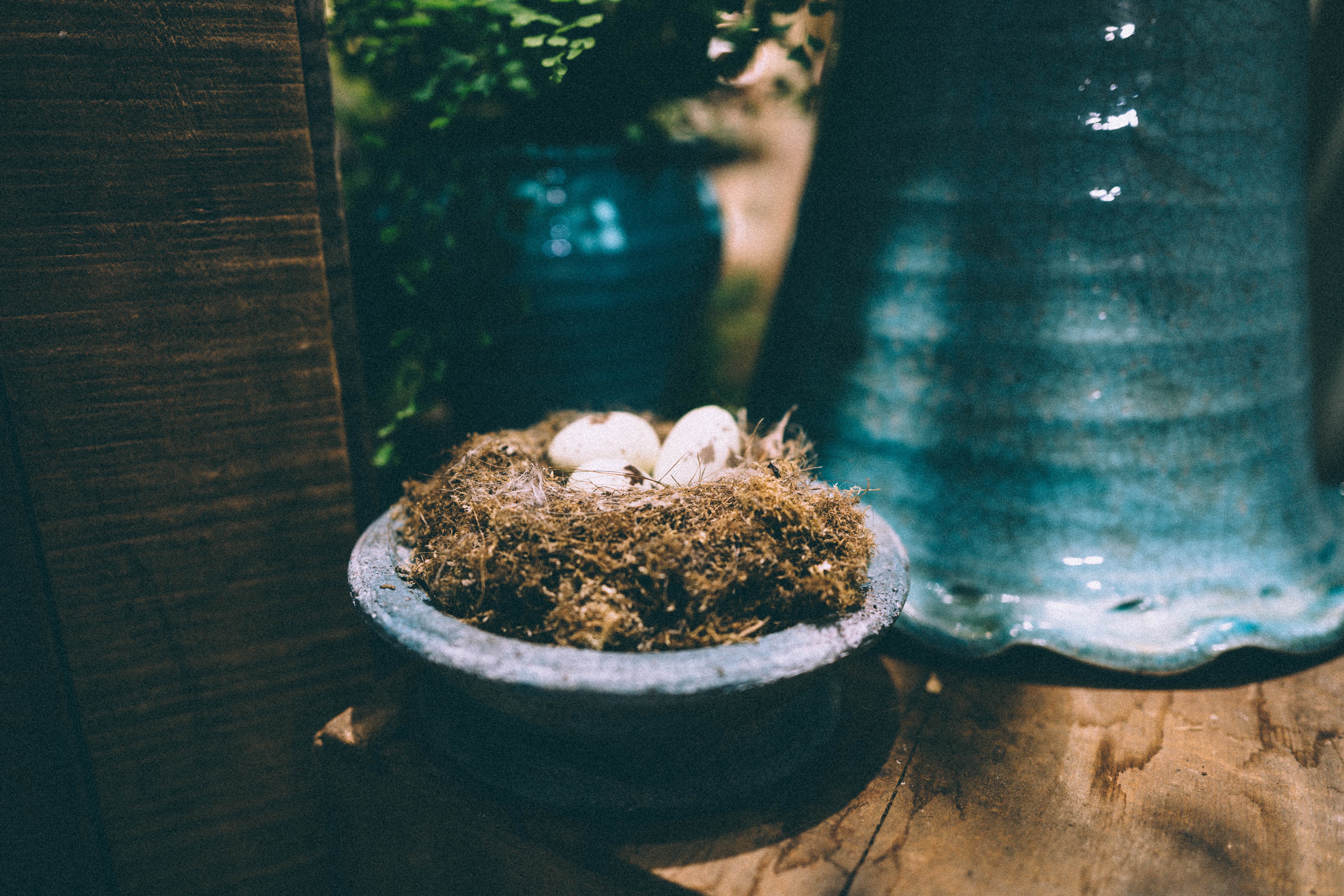 In a warm, softly lit environment, a small nest cradles two delicate eggs, inviting a sense of tranquility and anticipation. The earthy tones of the moss contrast beautifully with the vibrant blue of the ceramic pieces in the background, creating a harmonious composition. This intimate scene captures the essence of nature's fragility and the quiet beauty of new beginnings.