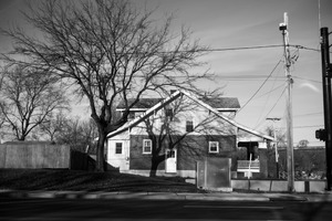 A solitary house stands against a stark grey sky, its simple architecture juxtaposed with the gnarled branches of a bare tree, evoking a sense of emptiness. The interplay of shadows from the tree across the facade adds depth, while the absence of color emphasizes the haunting quietness of an early winter day. Power lines crisscross in the background, hinting at life just beyond this peaceful scene, suggesting both isolation and connection.