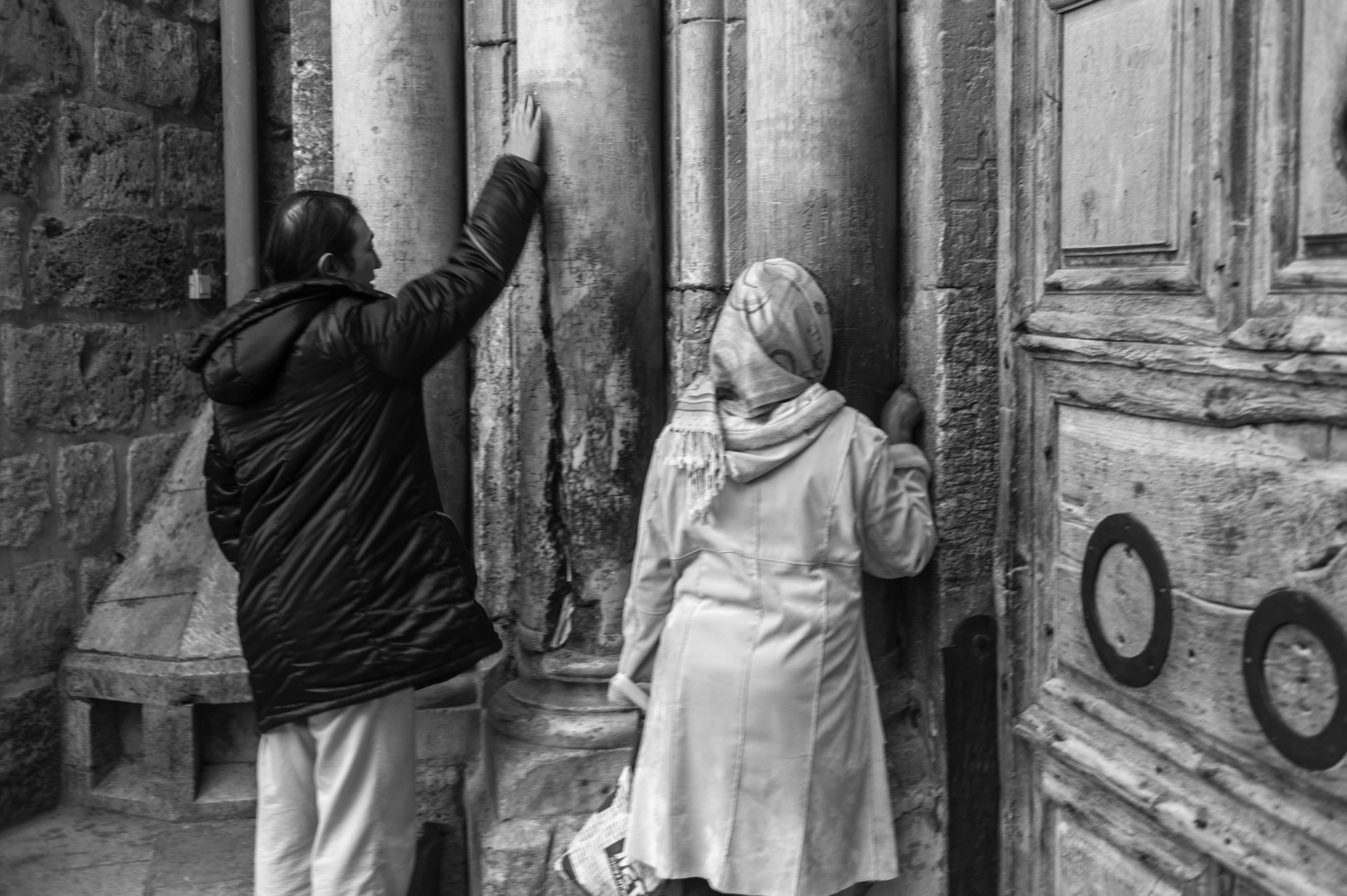 The photograph captures two women engaged in a moment of quiet contemplation against the backdrop of weathered stone columns. The black-and-white composition enhances the mood of intimacy and history, highlighting the textures of the old architecture. Soft natural light illuminates their figures, casting gentle shadows and emphasizing their connection to the space around them.