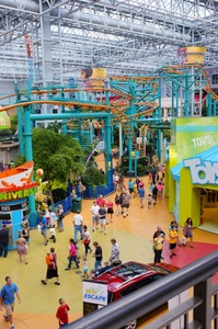 This lively photograph captures a bustling indoor amusement park, brimming with colorful attractions and excited visitors. The overhead roller coaster loops joyfully against a backdrop of bright greens and yellows, while sunlight filters through the vast roof, illuminating the cheerful atmosphere. Families and friends meander through the space, exuding joy and the carefree spirit of a day spent in fun-filled adventure.