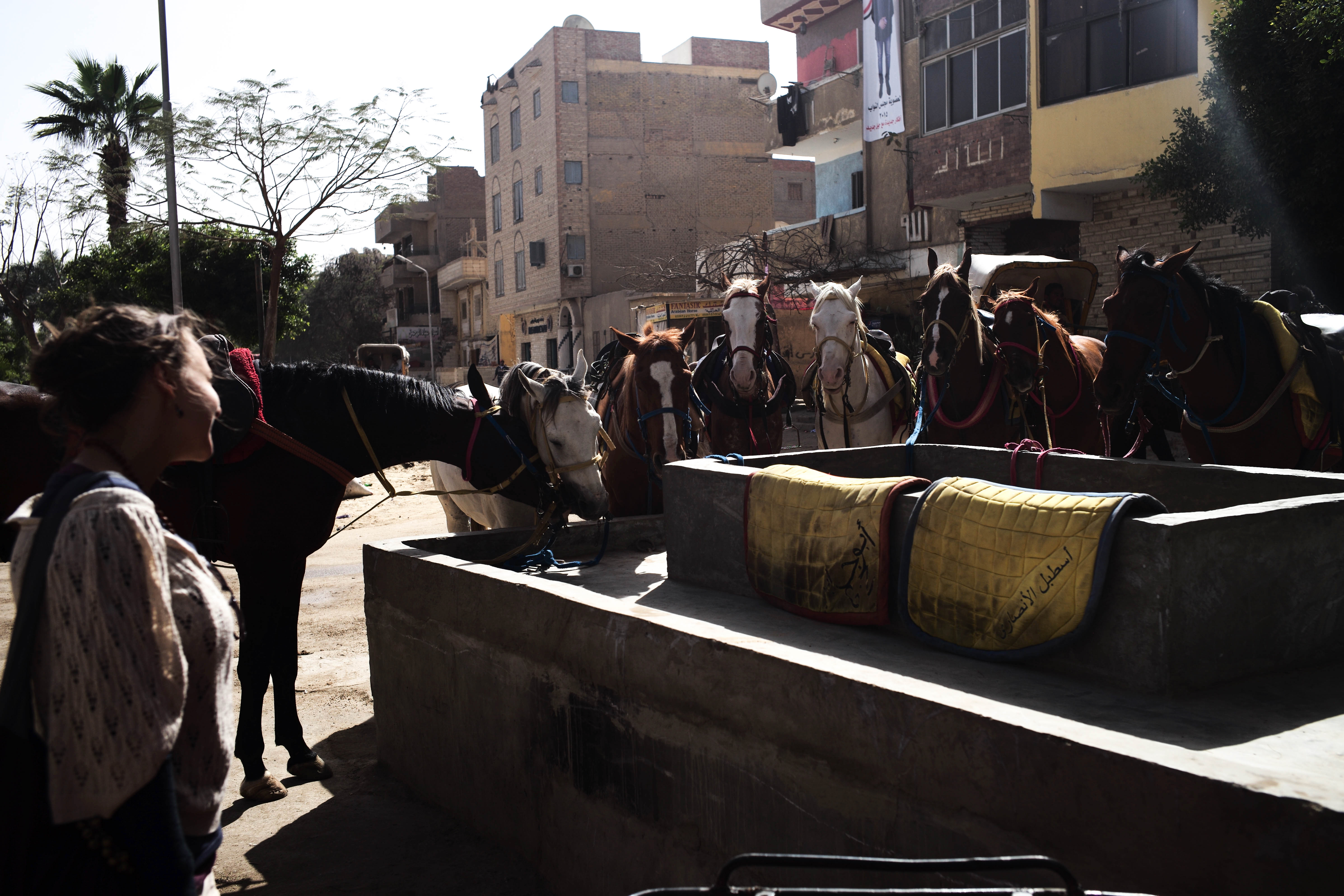 In this vibrant scene, a group of horses stands near a well while a woman gazes at them, her expression curious and contemplative. The sunlight casts dramatic shadows, enhancing the textures of the horses' coats and the rustic surroundings, creating a warm and inviting atmosphere. The juxtaposition of the horses' natural grace with the urban backdrop evokes a sense of harmony between tradition and modern life.