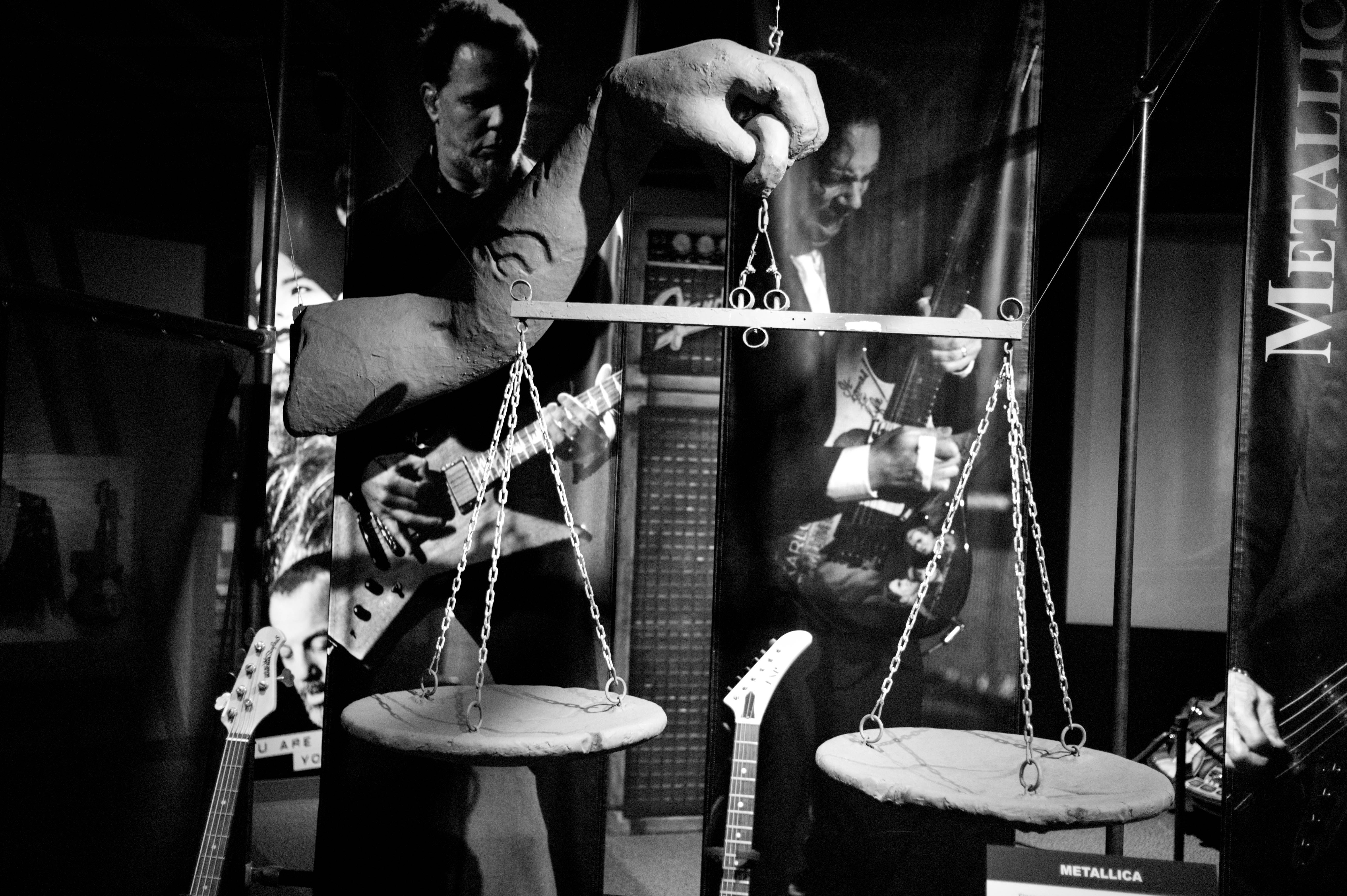 The photograph captures a striking moment in black and white, emphasizing a giant hand holding a balance scale against a backdrop of iconic rock figures. The dramatic lighting casts deep shadows, creating a mood of intensity and contemplation, as the juxtaposition of music and weight hints at the balance between art and reality. The composition is both bold and intricate, drawing the viewer's eye to the textured hand and the suspended scales, surrounded by reminders of rock history.