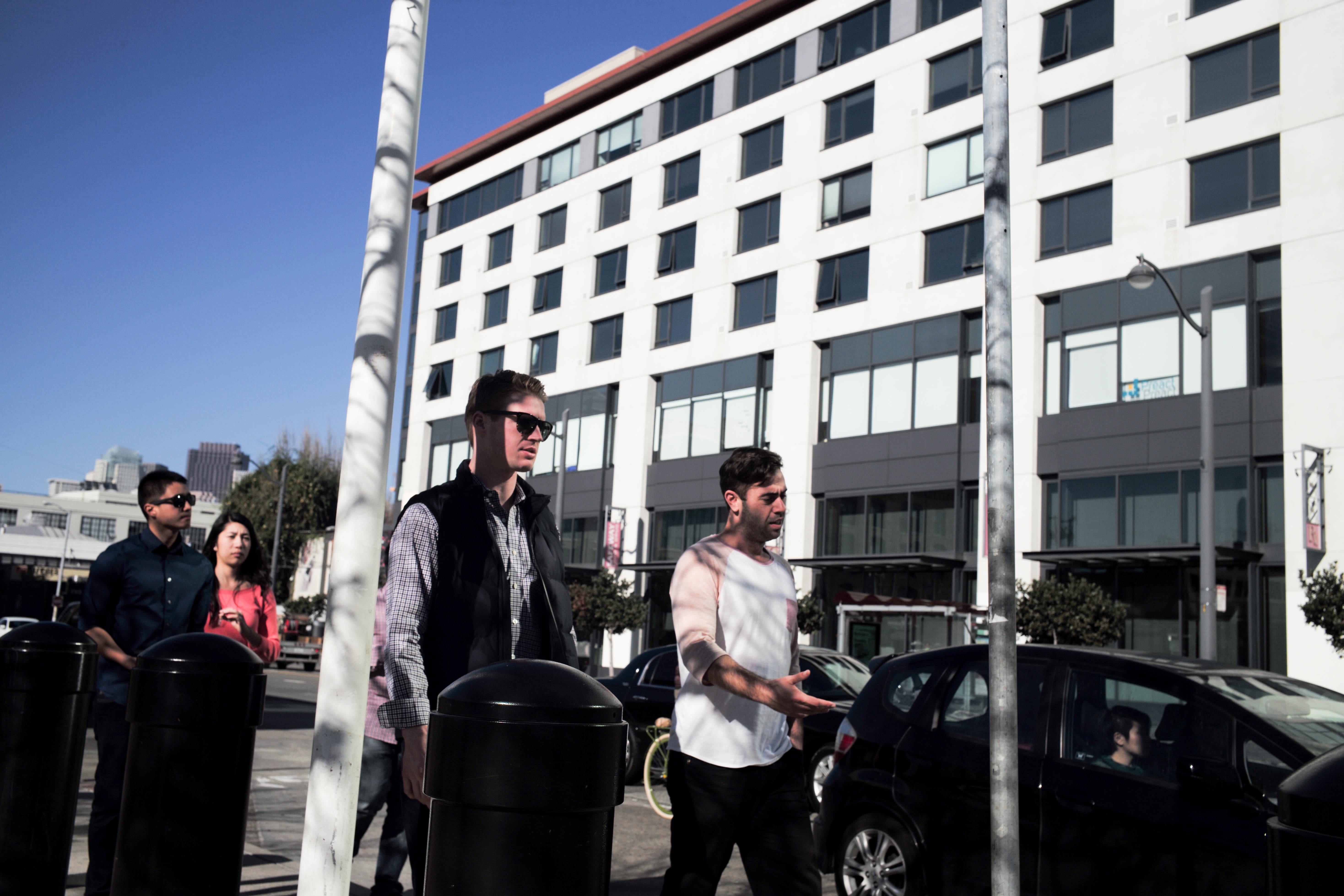 In a sunlit urban setting, a group of four individuals walks past a modern building, their expressions reflecting a blend of focus and casual conversation. The bright blue sky enhances the scene’s vibrant mood, while shadows and architectural lines add depth and structure. The sharp contrasts of light and dark amplify the dynamic energy of city life.