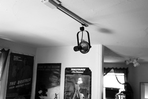 The photograph captures a solitary spotlight hanging from the ceiling, casting a soft light in a dimly lit space adorned with vintage movie posters. The monochrome palette enhances the nostalgic atmosphere, evoking a sense of quiet introspection. With the absence of vibrant colors, the focus shifts to the subject and the stories hinted at in the shadows around them.