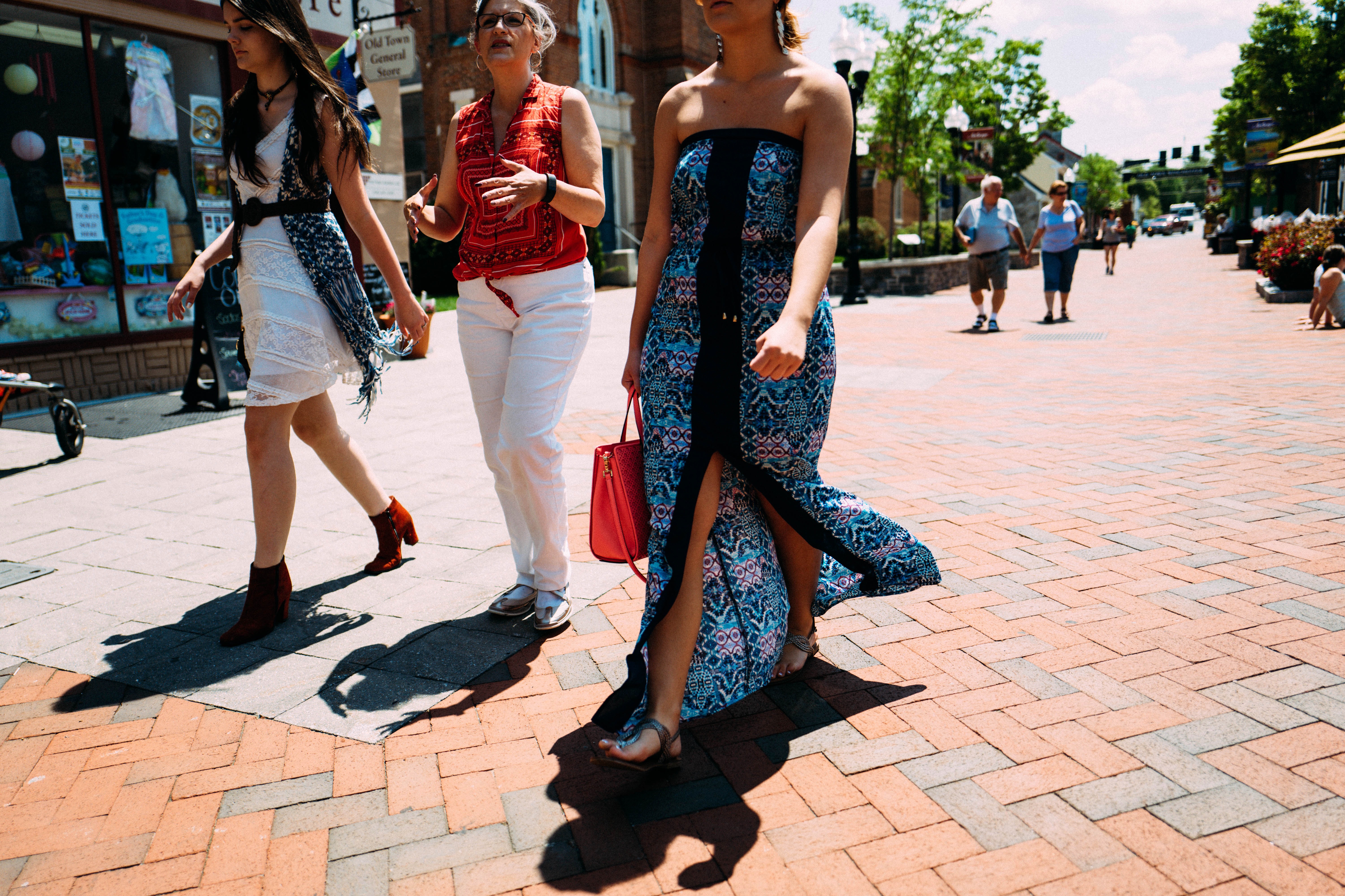Three women walk confidently along a sunlit brick pathway, embodying a vibrant yet relaxed summer atmosphere. The light bounces off their colorful outfits, casting playful shadows and enhancing the lively scene around them. Lush greenery and distant pedestrians create a inviting backdrop, suggesting a bustling day filled with casual exploration.