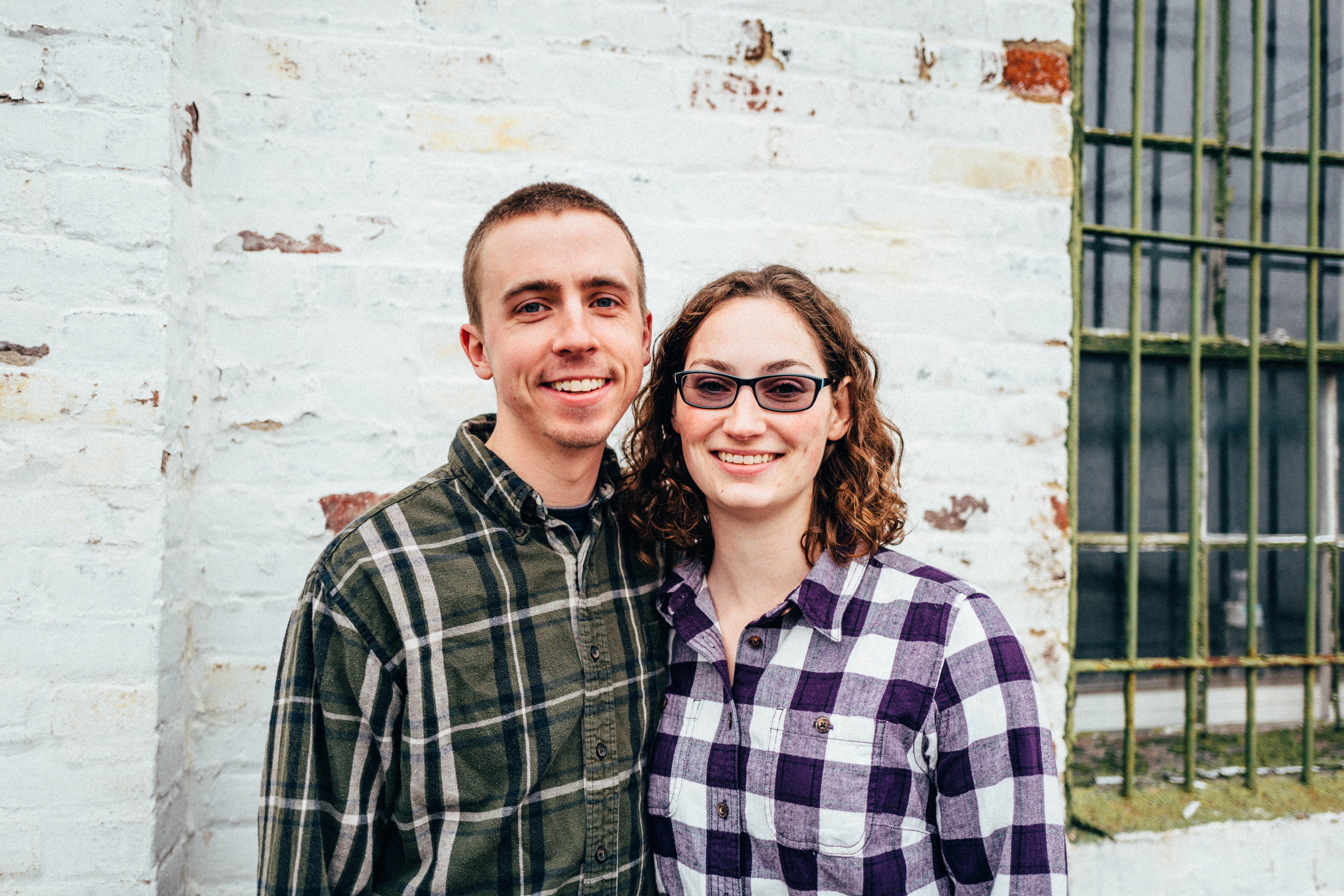The photograph captures a joyful moment between two friends, standing closely together against a weathered brick wall. The muted colors of their plaid shirts contrast with the urban backdrop, creating a relaxed yet intimate atmosphere. Soft, diffused light bathes the scene, enhancing the warmth of their smiles and the comfort of their camaraderie.