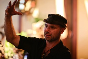 The photograph captures a man in mid-conversation, animatedly gesturing with one hand raised. The warm, soft lighting enhances the intimate atmosphere, while the blurred background suggests a lively environment, drawing focus to his expressive features and engagement. The composition balances his expressive pose with hints of greenery, creating a sense of connection between him and the surrounding space.