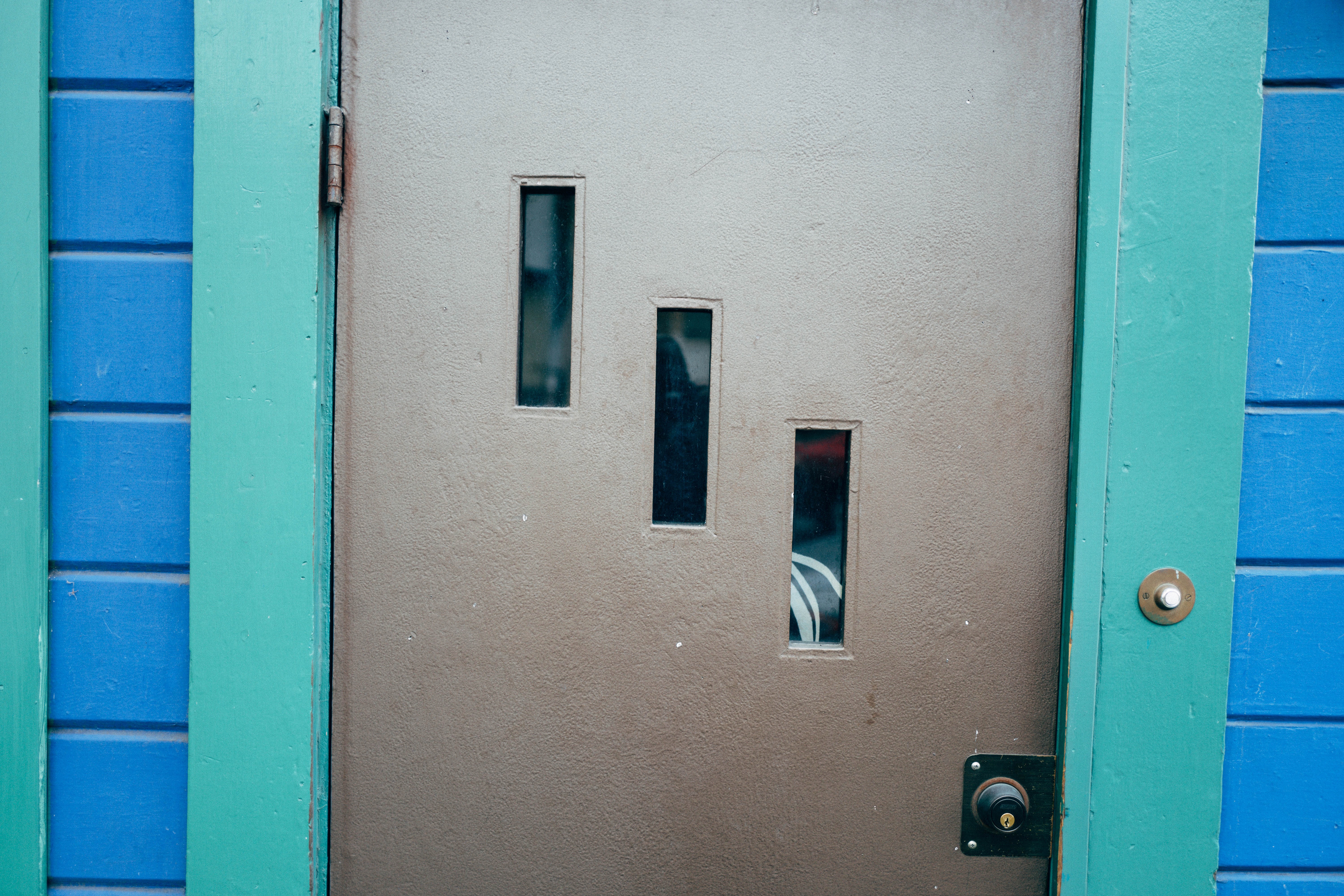 The photograph centers on a textured brown door set against vibrant blue wood siding, inviting intrigue with its narrow viewing windows. The muted light softly falls on the door, evoking a sense of mystery and anticipation. The contrasting colors create a playful yet enigmatic atmosphere, drawing the viewer's eye to the simple but striking composition.