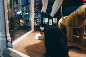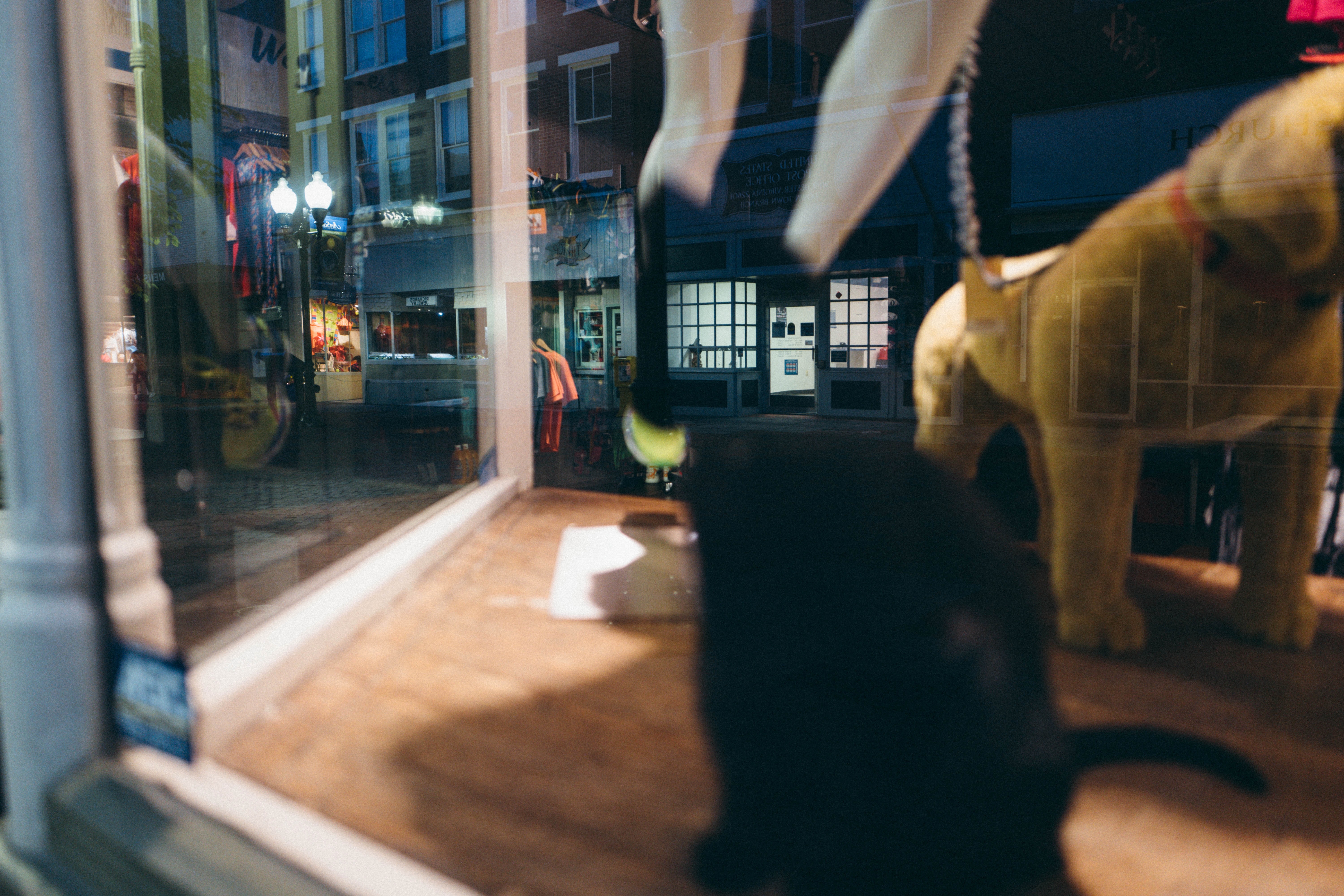 A dimly lit shop window reveals a whimsical display of plush toys, with a subtle reflection of the bustling street behind it. The scene captures a serene mood, blending the charm of the inanimate with fleeting moments of life outside, highlighted by soft, warm lighting that creates a cozy atmosphere. A shadowy feline figure foregrounds the composition, suggesting a quiet observer in this enchanting urban landscape.