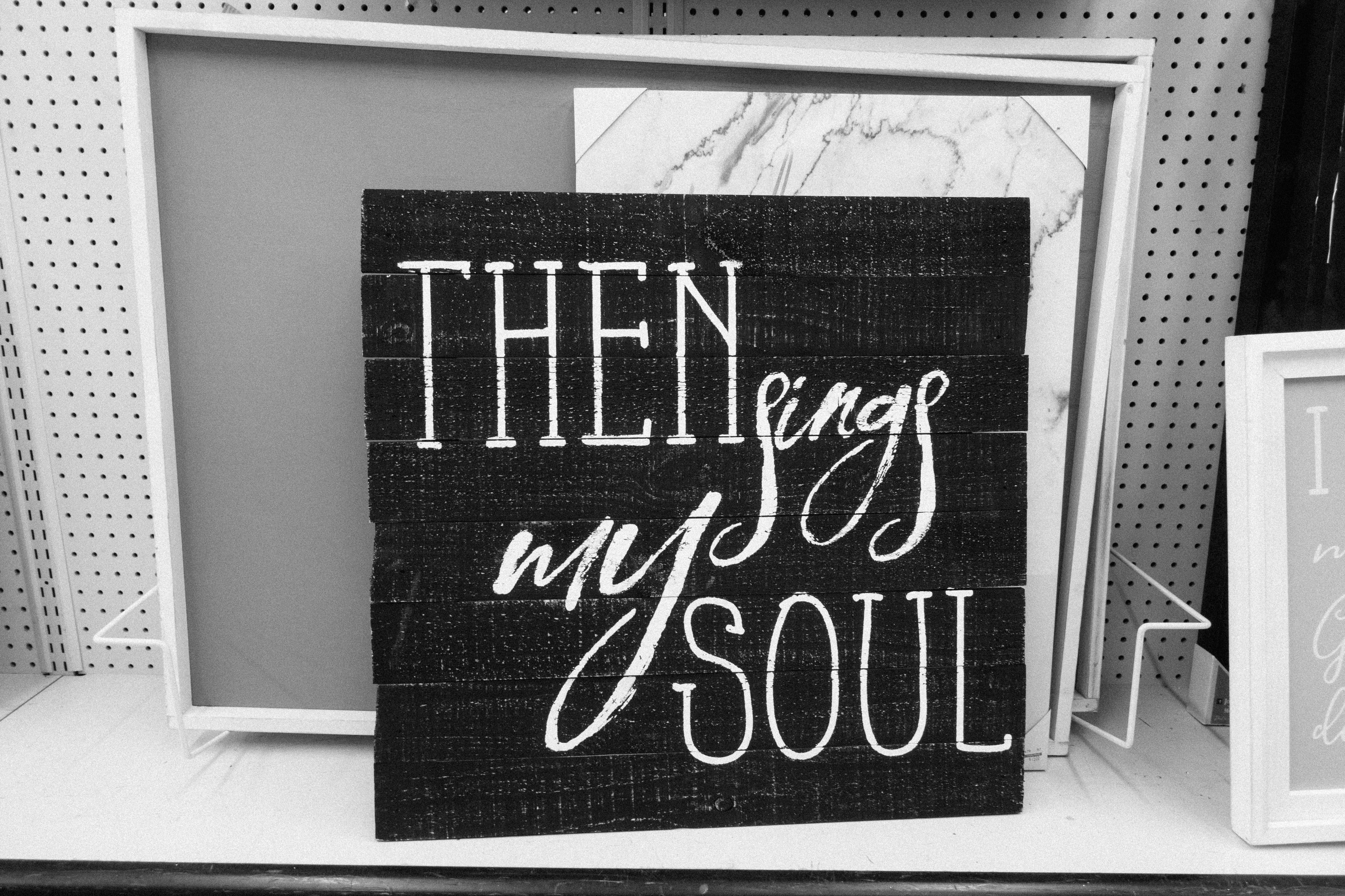 The photograph captures a rustic wooden sign adorned with the phrase 'Then sings my soul,' rendered in an elegant mix of bold and cursive typography. The monochrome palette enhances the emotional weight of the text, evoking a sense of introspection and warmth amidst a backdrop of framing materials, hinting at a creative space. Soft lighting subtly highlights the texture of the wood, inviting the viewer to reflect on the soulful message within the piece.