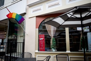 This photograph captures a quaint eatery adorned with a colorful rainbow flag, symbolizing inclusivity. The inviting atmosphere is emphasized by the cheerful display of local art for sale, framed by soft curtains and greenery in the window. The muted natural lighting enhances the casual vibe, drawing attention to the intermingling of culture and community.