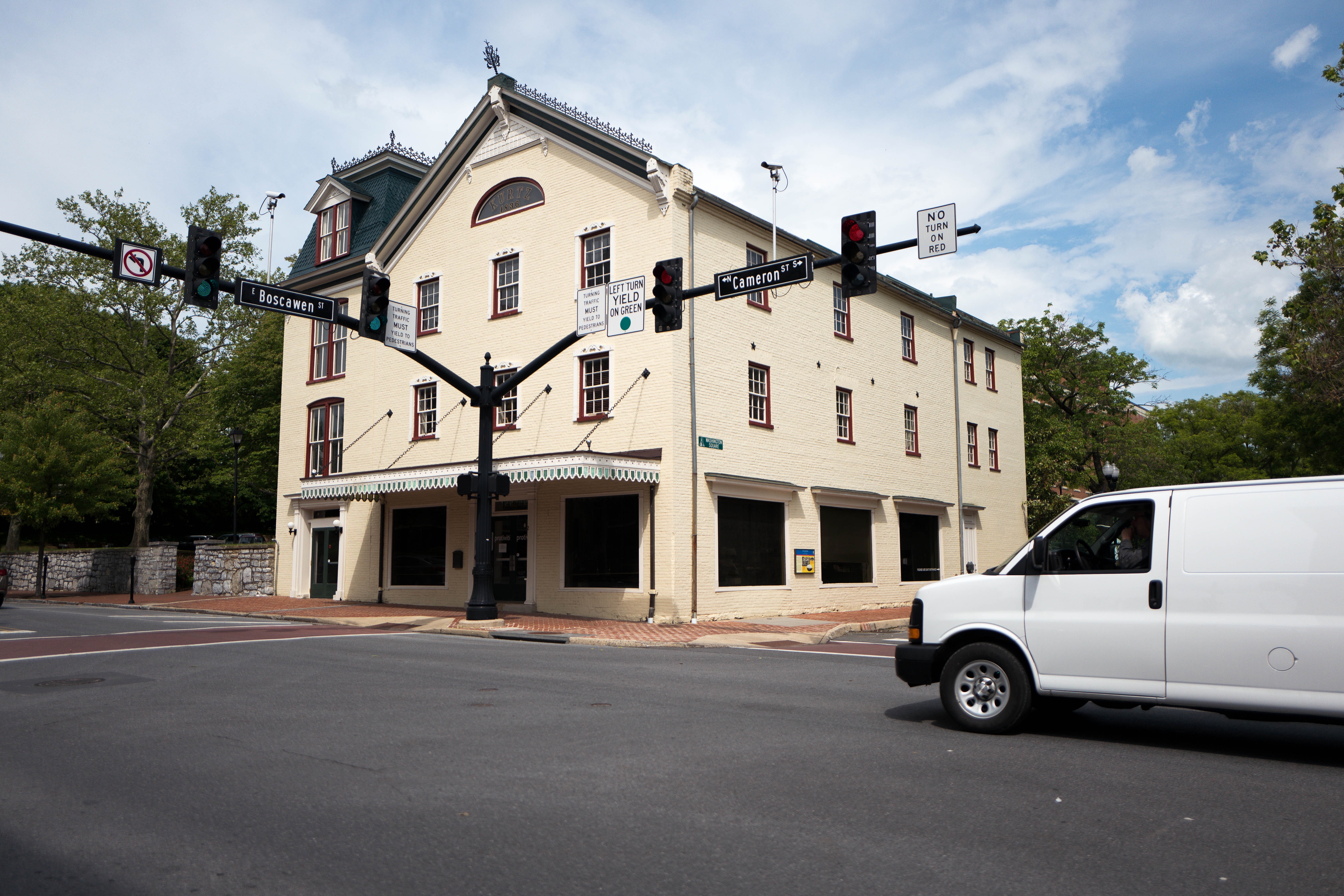 The photograph captures a quaint, historic building at a bustling intersection, exuding a sense of charm and nostalgia. Bright, natural light enhances the building’s architectural details, while the traffic signals and a passing white van add a dynamic urban touch. The scene portrays a balance between the tranquility of the structure and the movement of city life.