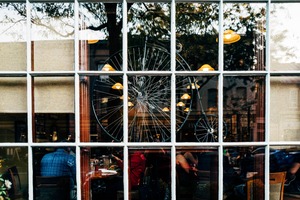 The photograph captures a vibrant restaurant scene through a grid of large window panes, where reflections create a layered effect. An artistic bicycle wheel adorns the wall inside, adding character and charm to the inviting atmosphere. Soft lighting from hanging fixtures casts a warm glow, enhancing the intimate mood of shared meals and conversation.