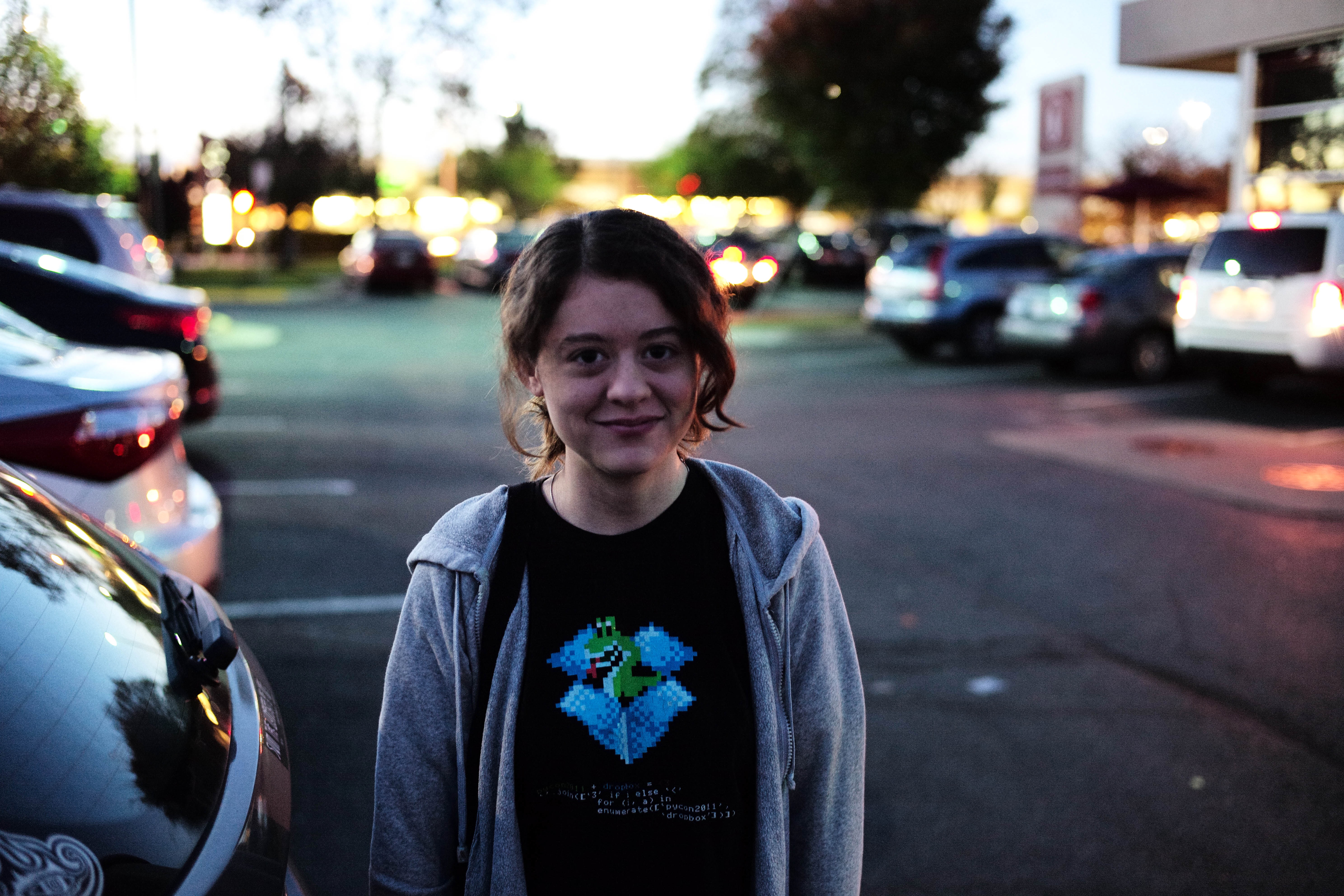 In this candid portrait, a young woman stands confidently in a parking lot, illuminated by soft, ambient light from nearby storefronts. Her relaxed smile contrasts with the bustling backdrop of blurred cars and distant lights, creating a warm, inviting mood. The composition highlights her casual attire and the early evening atmosphere, blending intimacy with a sense of urban life.