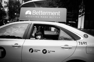 In this striking black-and-white photograph, a young child gazes thoughtfully from the backseat of a taxi, highlighting a moment of curiosity and wonder. The juxtaposition of the child's innocence against the urban setting, marked by the taxi's signage, creates a poignant atmosphere. Soft lighting adds depth, enhancing the contemplative mood of the scene as the city pulses with life just outside the window.