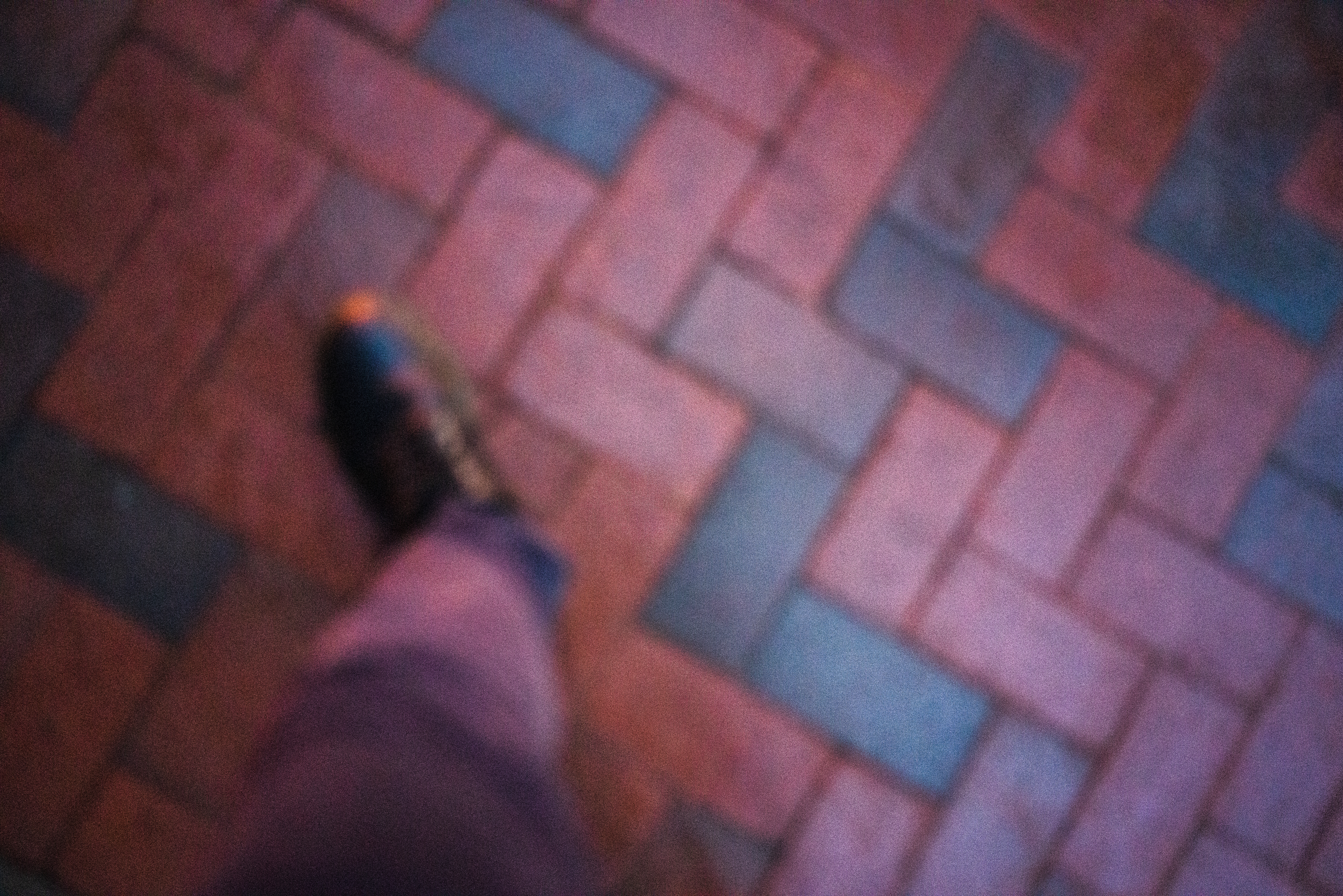 The photograph captures a blurred view of a foot stepping on a patterned brick pavement, suggesting movement and the passage of time. Soft, warm hues of red and gray convey a nostalgic vibe, evoking a sense of exploration and spontaneity. The composition, focused on the foot, creates an intimate perspective, emphasizing the experience of being in the moment.