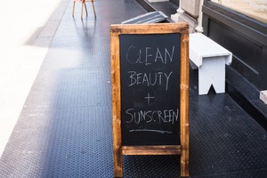 The photograph features a simple wooden chalkboard sign displaying the enticing phrases 'Clean Beauty + Sunscreen,' inviting passersby to explore its offerings. The bright sunlight casts soft shadows on the textured pavement, enhancing the inviting, cheerful mood of a sunny day. The surrounding urban environment is subtly hinted at, offering a glimpse of a lively street scene in the background.