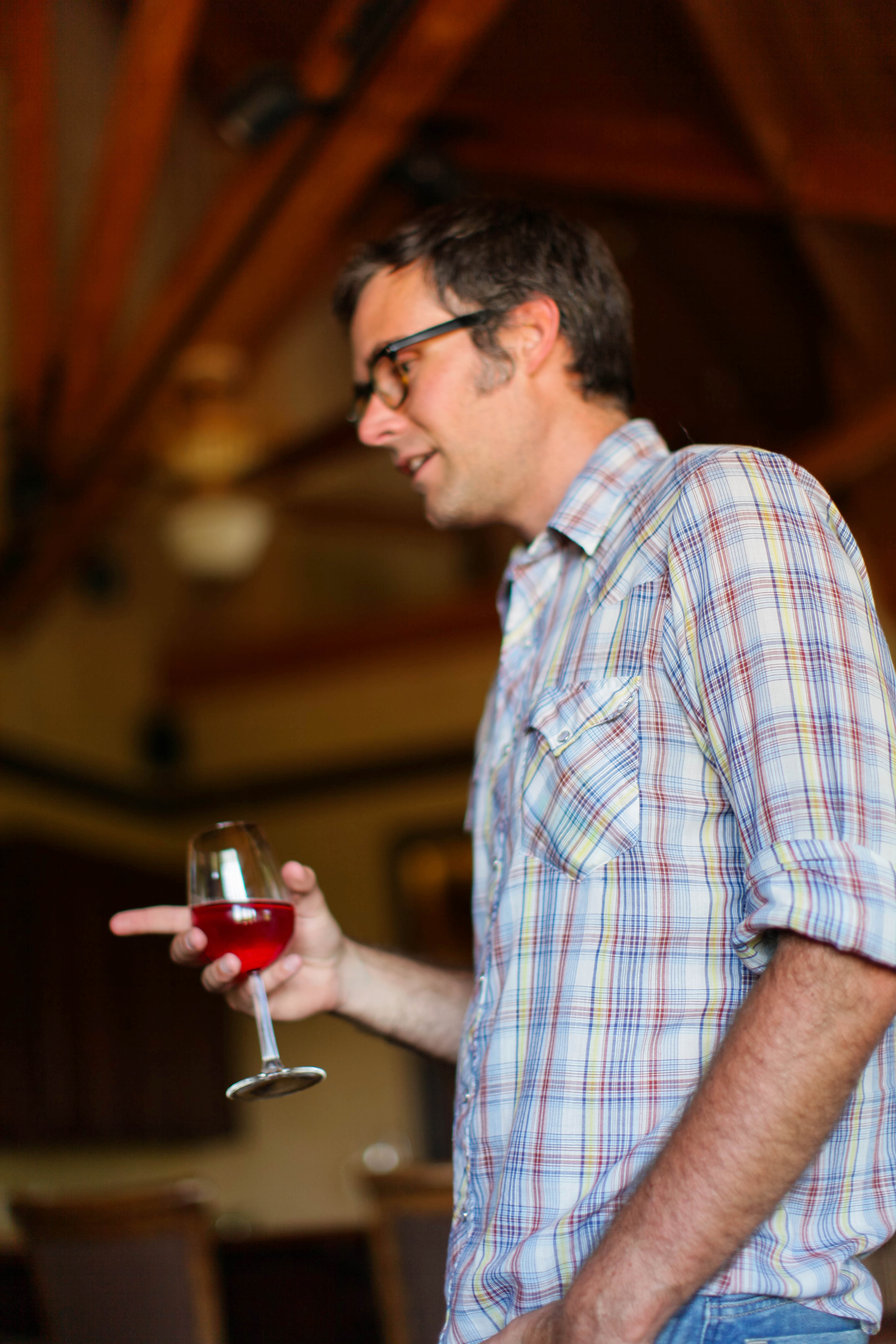 The photograph captures a man in a plaid shirt engaged in conversation, holding a glass of red drink. The warm lighting highlights the rustic ambiance, creating an inviting atmosphere that suggests camaraderie and relaxation. The soft focus on the background enhances the intimate mood, drawing attention to the subject's expressive gestures.