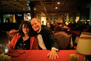 Captured in a softly lit restaurant, the photograph features a couple embracing the moment with warm smiles. The elegant setting, adorned with red tablecloths and subtle lighting, evokes a sense of intimacy and nostalgia, inviting the viewer into their world. The subject’s contrasting attire adds a playful touch to the overall romantic mood.