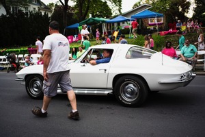 In this lively photograph, a classic white Corvette moves past a crowd during a community event, conveying a sense of nostalgia and celebration. The composition captures the contrast between the sleek car and the casual pedestrians, while the warm, natural lighting enhances the cheerful atmosphere. Brightly colored tents and engaged spectators in the background add to the festive, summertime mood.