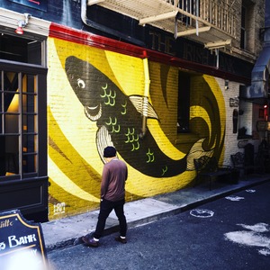 A lone figure strolls through a sunlit alley, captivated by a vibrant mural featuring a stylized fish against a bright yellow backdrop. The contrast between the muted tones of the individual and the bold colors of the artwork creates a dynamic visual conversation. The interplay of light and shadow enhances the feeling of introspection in this urban landscape.