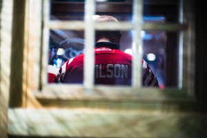 Through a wooden window frame, a figure wearing a red jersey with the name 'Wilson' stands with their back turned. The soft, diffused lighting creates an intimate atmosphere, highlighting the subject's solitude and contemplative mood amid a bustling environment just beyond the glass.