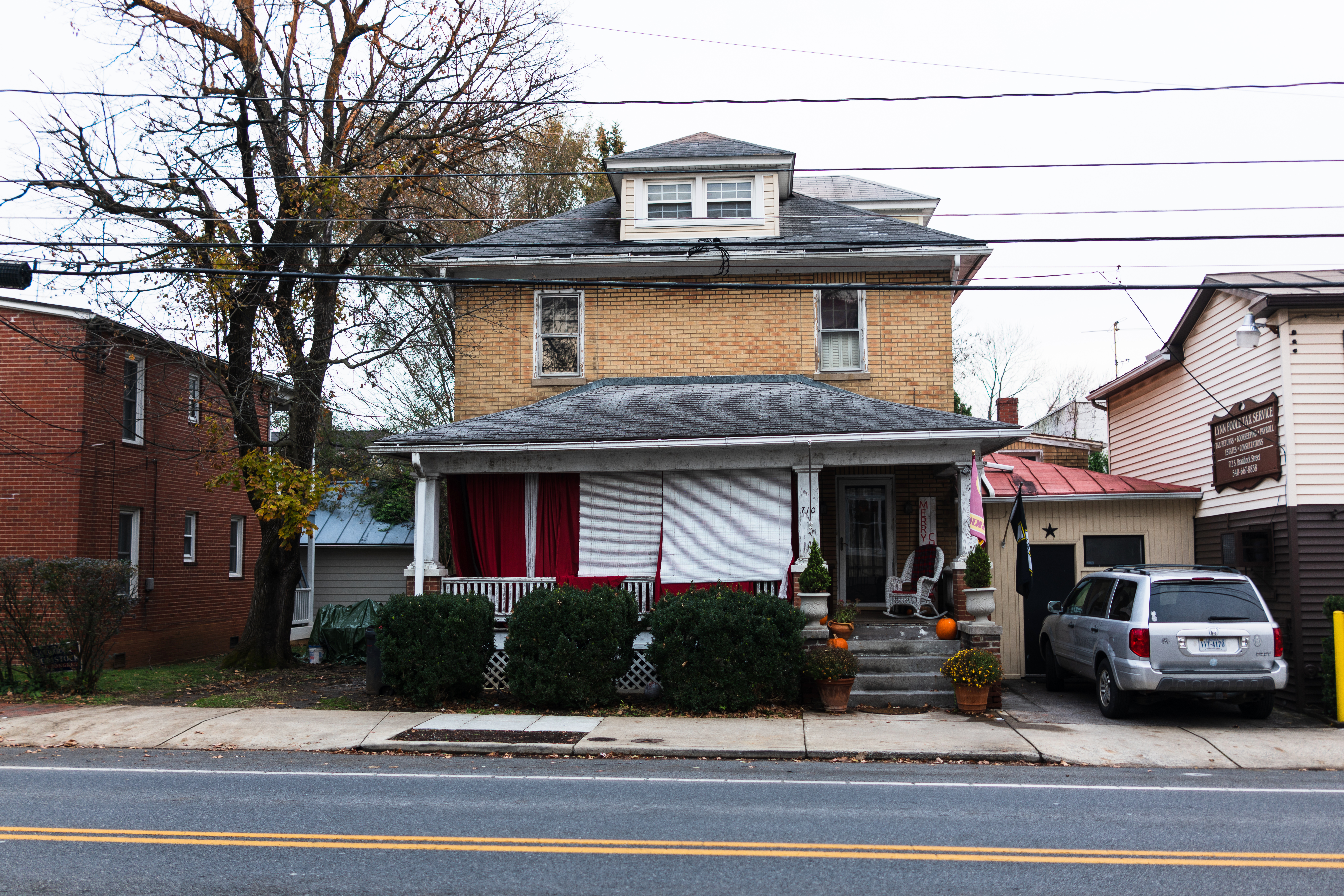 A charming two-story brick house stands prominently on a quiet street, exuding a sense of nostalgia. The muted tones of autumn, paired with the inviting red curtains peeking through the windows, create a warm yet subdued mood. Delicate greenery frames the front porch, hinting at the home's character amidst the urban backdrop.