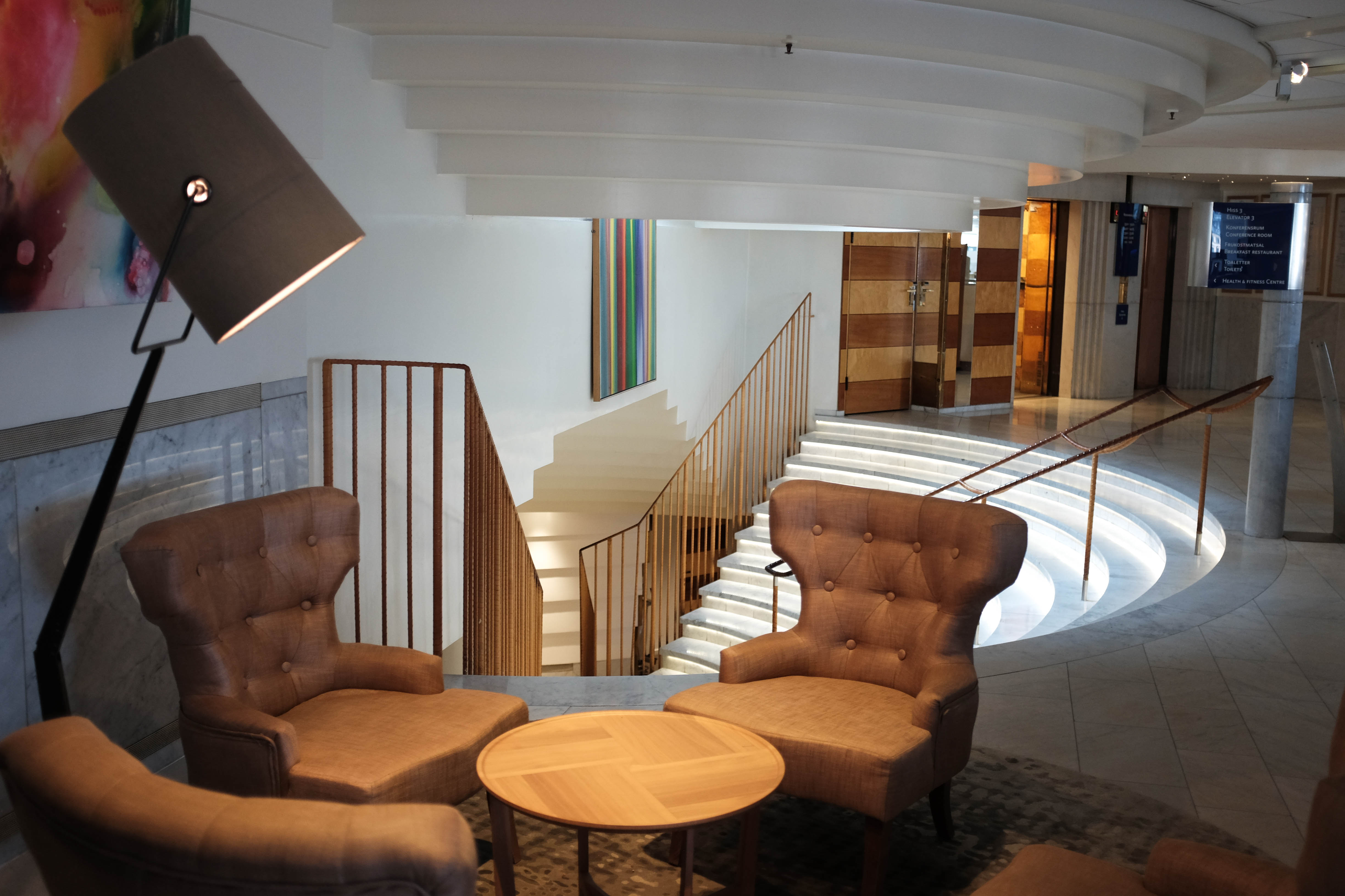 This photograph captures a serene lounge area, characterized by plush, vintage armchairs and a warm wooden table. The soft, diffused lighting enhances the inviting atmosphere, while the sleek staircase and colorful art pieces add a touch of modern sophistication. The overall composition invites relaxation and contemplation in a stylish setting.