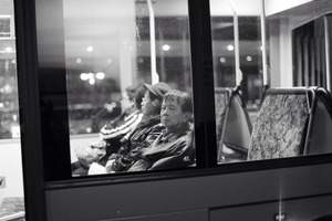 This monochromatic photograph captures three figures sitting quietly on a bus, their expressions reflecting contemplation and solitude. The soft, diffused lighting creates a muted atmosphere, while rain-streaked windows frame the scene in a moment of introspection. The composition draws the viewer's eye to the thoughtful gaze of the man in the foreground, evoking a sense of shared experience among strangers in transit.