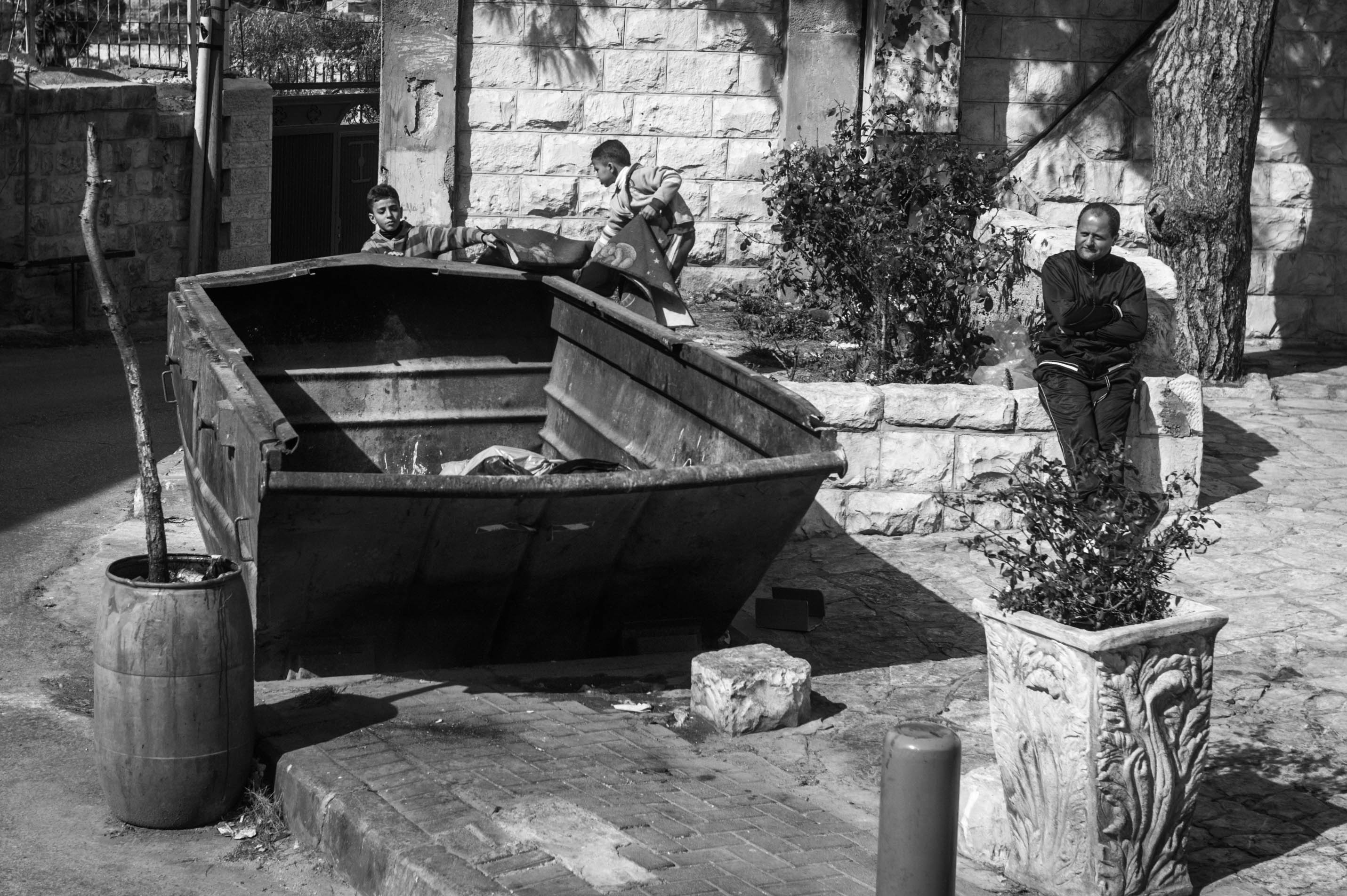 The photograph captures a moment of urban life, where two children play atop a weathered dumpster while an older man leans against a wall, observing the scene. The stark black and white contrast highlights the rugged textures of the surroundings, creating a mood of nostalgic simplicity. Soft natural light enhances the depth, emphasizing the juxtaposition of youthful energy against the stillness of the adult's presence.