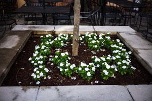 This photograph captures a quaint garden arrangement where vibrant white flowers bloom in a heart shape around a central tree. The soft, natural lighting envelops the scene, creating a peaceful and inviting atmosphere that invites contemplation. The stark contrast of the flowers against the muted stone and surrounding furniture enhances the organic beauty of this urban haven.