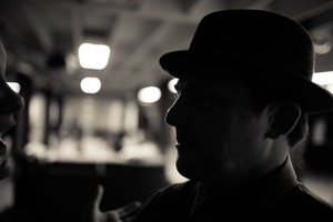 In this moody black-and-white photograph, the silhouettes of two figures engage in an intimate yet ambiguous dialogue, their expressions hidden in shadow. The soft glow of overhead lights creates a striking contrast, adding depth and intrigue to the composition. The atmosphere feels tense and contemplative, inviting viewers to ponder the nature of their exchange.