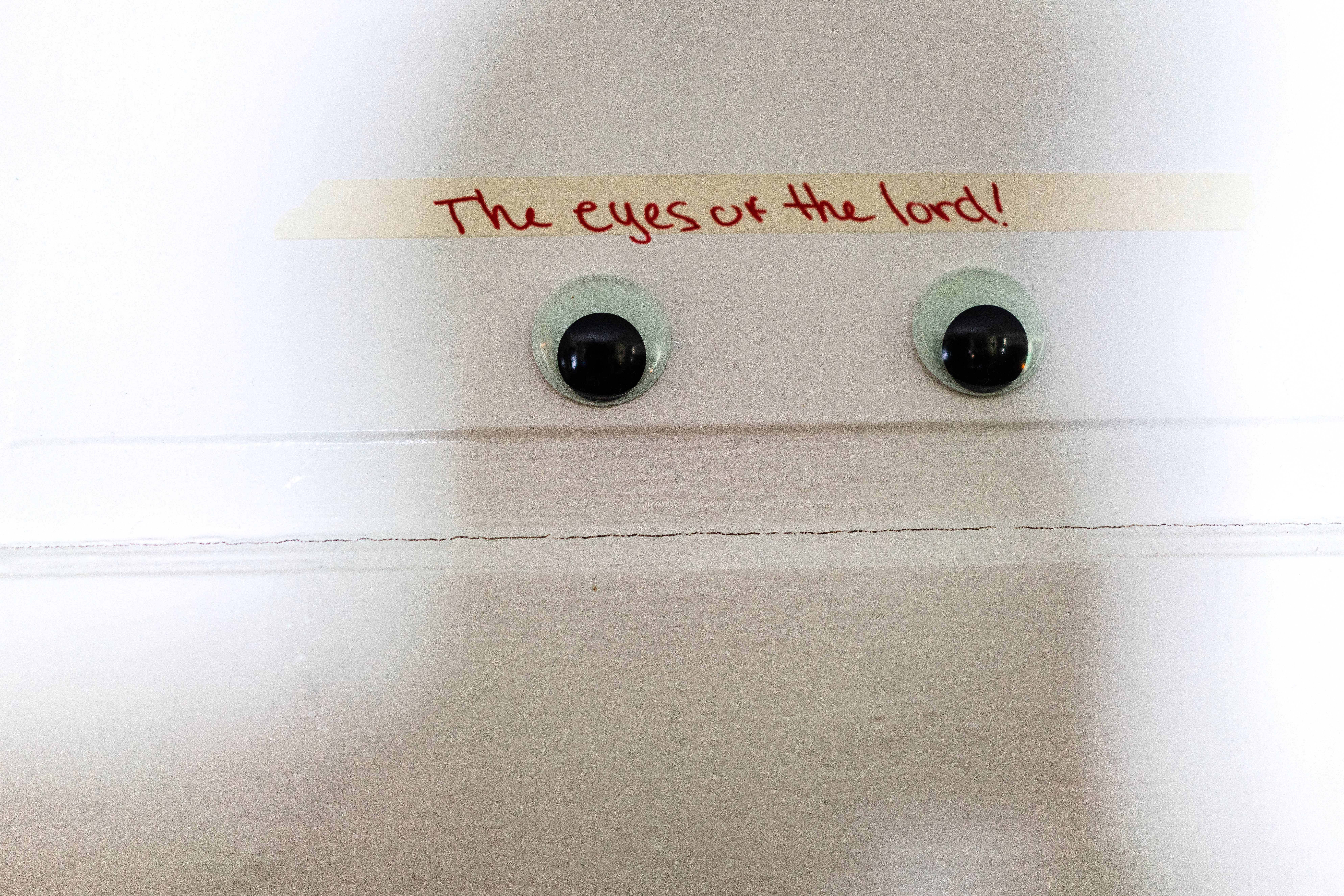 The photograph features a pair of googly eyes affixed to a plain white surface, accompanied by a handwritten message that reads, "The eyes of the lord!" The light gently illuminates the scene, enhancing the playful and slightly surreal mood as the eyes seem to gaze out, creating an eerie yet humorous sense of watchfulness.