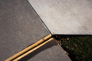 This photograph captures a close-up view of a sidewalk corner, where different textures and colors converge. The interplay of smooth and rough surfaces, illuminated by soft natural light, evokes a sense of quiet contemplation. The subtle contrast between the concrete and the vibrant grass creates an intriguing visual rhythm, inviting the viewer to appreciate the beauty in ordinary moments.