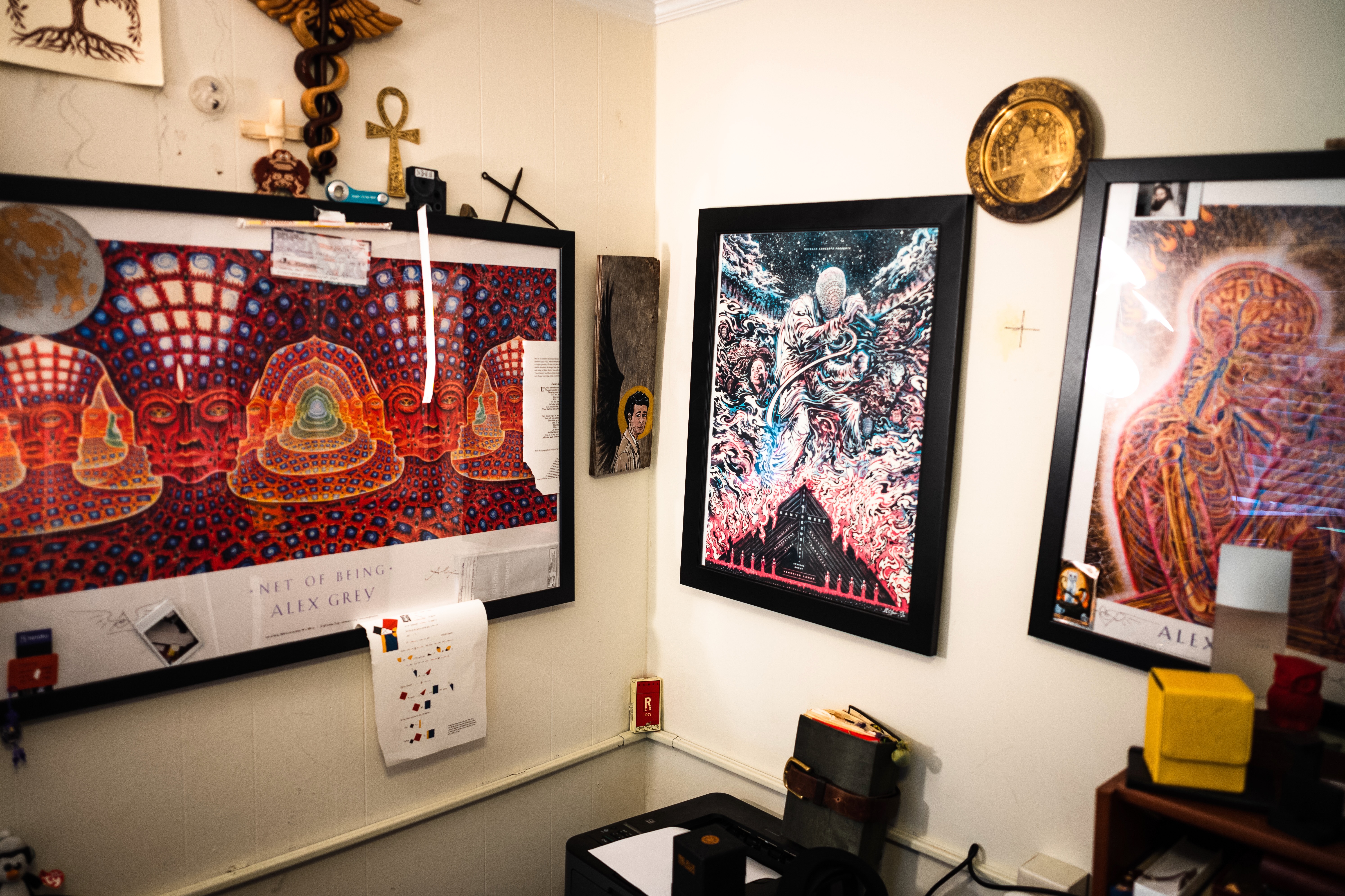 This intimate corner showcases vibrant artwork from Alex Grey, enveloping the viewer in a realm of surreal spirituality. The warm lighting contrasts with the intricate details of the prints, creating a contemplative mood that invites exploration. Layered textures and framed images breathe life into the space, hinting at a personal sanctuary filled with deeper meaning.