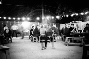 In this atmospheric black and white photograph, a lively outdoor gathering unfolds under soft string lights. The blurred figures create a sense of movement amidst the stillness at wooden tables, evoking a warm, nostalgic mood of camaraderie and shared moments. Contrasting shadows and bright lights enhance the intimate yet dynamic vibe of the evening.