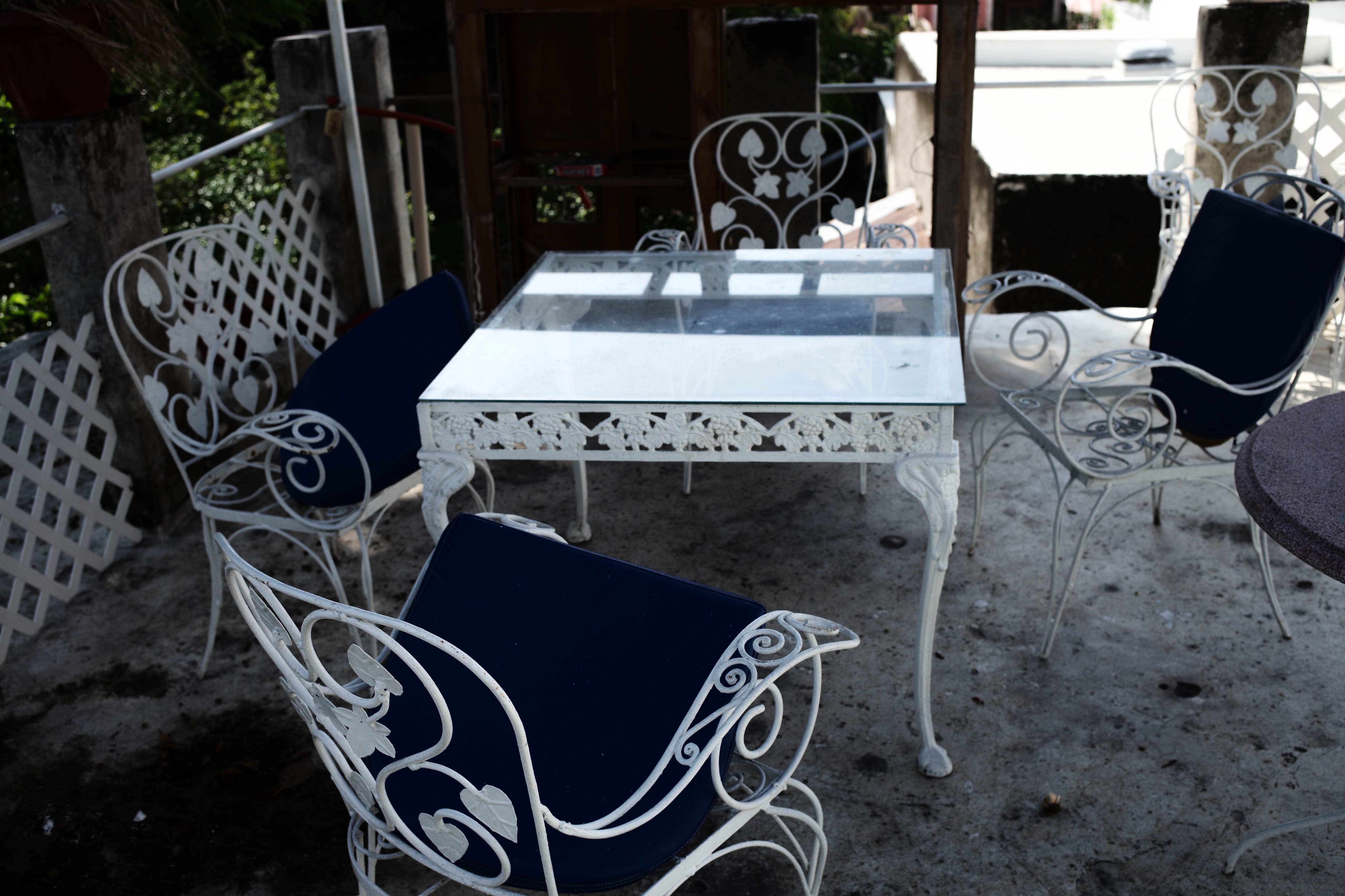 A charming outdoor setting featuring an ornate white table surrounded by intricately designed chairs, their navy cushions inviting moments of leisure. The bright sunlight casts gentle shadows, enhancing the serene atmosphere, while the hints of lush greenery in the background evoke a sense of tranquility. The composition captures both elegance and comfort, suggesting a perfect spot for relaxed conversations.