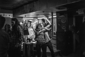 In a dimly lit venue, the energy of a live performance pulsates through the crowd, captured in striking black and white. The foreground boasts carefree dancers, their joyful expressions radiating warmth amidst the shadows, while a singer strums her guitar in the background, evoking a nostalgic, intimate vibe. The strong contrasts and playful movement create a dynamic atmosphere, inviting the viewer into this moment of celebration and music.