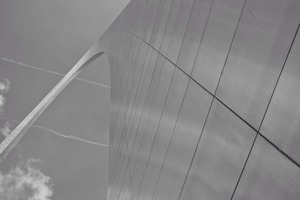 This photograph captures the grandeur of a monumental arch, shot from a low angle to emphasize its towering presence. The interplay of light and shadow on the metallic surface creates a dramatic contrast, while wispy clouds and contrails weave through the sky, enhancing the sense of depth and movement. Overall, the composition evokes a feeling of awe and modernity, drawing the viewer's gaze upward.
