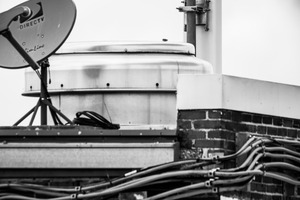 The photograph captures an assortment of industrial elements atop a building, showcasing a sleek metal circular structure and an array of colorful cables. The black and white composition lends a stark, gritty mood, while the sharp lines of the equipment contrast with the soft sky in the background. This juxtaposition highlights the complexity and functionality of modern urban architecture, evoking a sense of quiet industriousness.