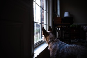 A dog gazes intently out a window, its profile illuminated by the soft, natural light streaming in. The warm glow contrasts with the surrounding shadows, creating a serene yet contemplative mood. The scene captures a moment of quiet anticipation, as the dog seems to be longing for the world beyond the glass.
