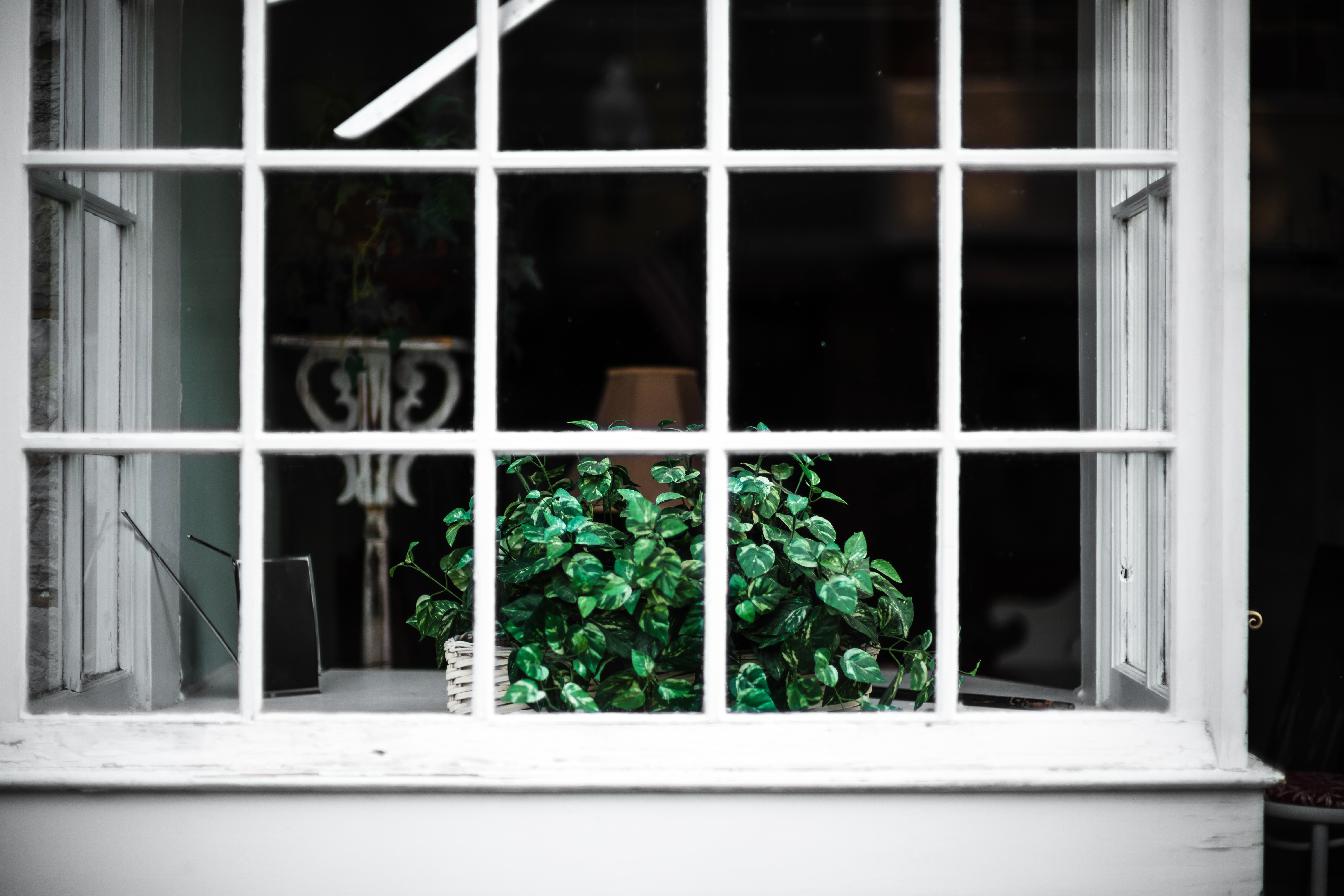 The image captures a tranquil indoor scene through a window, where a lush green plant stands prominently against a soft, blurred background. The composition of the grid-like window panes creates a structured yet inviting frame, contrasting the vibrant foliage with muted tones. Subdued lighting enhances the sense of calm, inviting viewers to contemplate the peaceful interior beyond the glass.