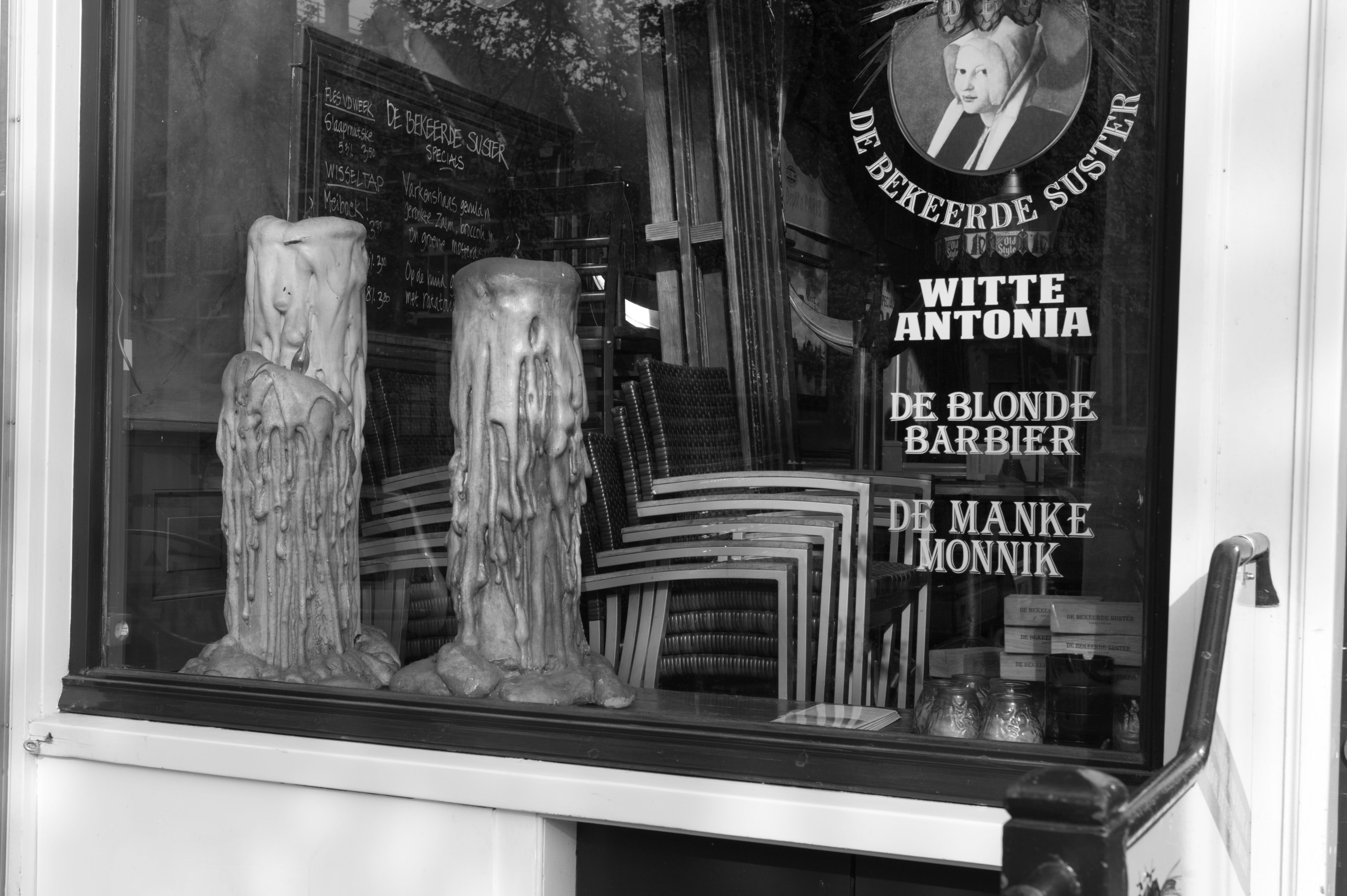 This black-and-white photograph captures a quaint storefront window featuring two wax candles with drips cascading down their sides, evoking a sense of nostalgia and warmth. The intricate play of light and shadow enhances the melting forms, while the background signage hints at a vintage charm, creating a captivating juxtaposition. The overall mood is contemplative, inviting viewers to ponder the stories held within this cozy scene.