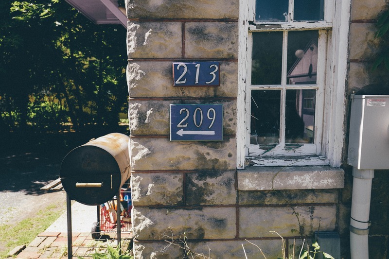This photograph captures the weathered facade of a stone building marked by house numbers 213 and 209, evoking a sense of nostalgia and quietude. The soft, natural lighting reveals the chipped window and rustic details, while the surrounding greenery adds a touch of life to the rustic scene. A vintage grill stands nearby, hinting at past gatherings, enhancing the layered narrative of memory and time.