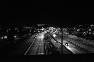 In this chiaroscuro landscape, an empty highway snakes through a serene city at night, illuminated by the soft glow of streetlights. The stark contrast of the black and white composition enhances the loneliness of the scene, while a solitary car adds a touch of movement against the stillness. The overall mood is contemplative, evoking a sense of solitude amid the urban expanse.