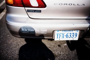 This photograph features the back of a silver Toyota Corolla, prominently displaying a thought-provoking bumper sticker that reads, "Who Would Jesus Bomb?" The composition captures the car against a stark asphalt backdrop, with sunlight illuminating the surface, creating a reflective quality that enhances the message's provocative nature.