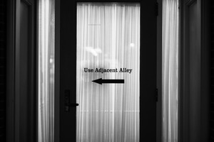 A softly illuminated doorway serves as a backdrop for a stark black arrow and text urging viewers to 'Use Adjacent Alley.' The sheer curtains cast gentle light, creating a contemplative mood that hints at mystery beyond the visible. The stark contrast of the sign against the delicate fabric invites curiosity about what lies on the other side.