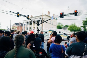 A crowd gathers at a busy intersection, eyes drawn towards an emergency scene. The mood is tense yet curious, as people stand close together, their expressions a mix of concern and intrigue. Soft, diffused lighting casts a somber tone over the scene, enhancing the urgency of the moment.
